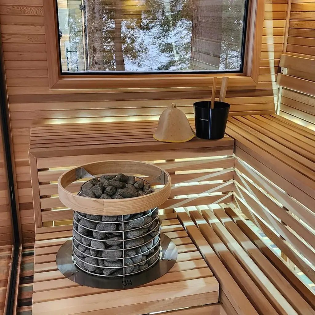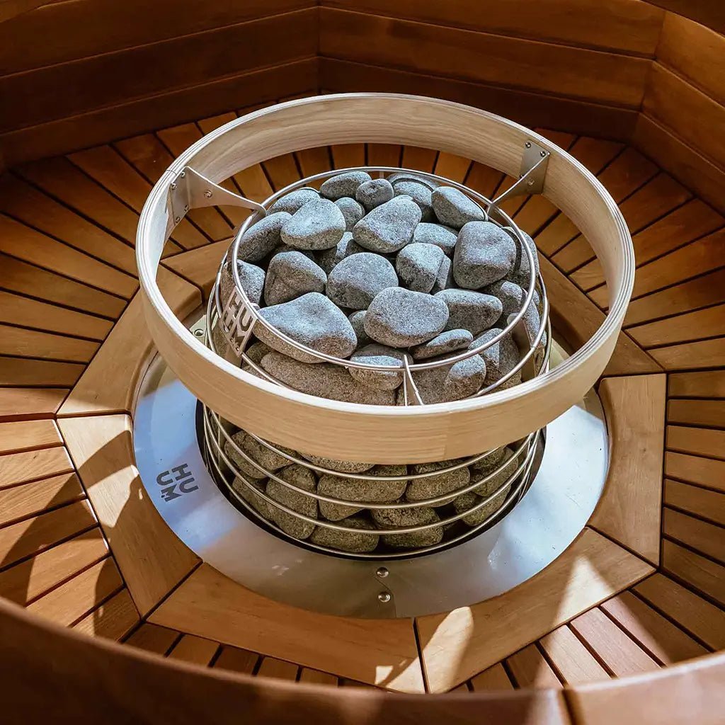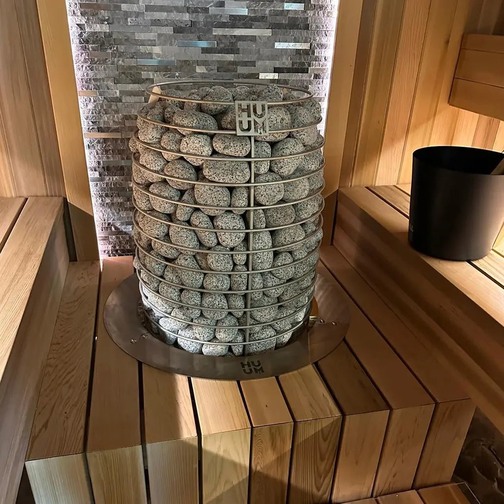 When embedding the HUUM HIVE electric sauna heater, a minimum of 350 mm / 13.8 inches of the heater body should be visible above the bench surface.